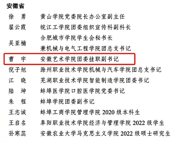 12月10日,共青团中央服务青年发展官方平台公众号“创青春”公示,校团委副书记、戏剧学院专职辅导员曹宇被评为2023年全国大中专学生志愿者暑期文化科技卫生“三下乡”社会实践活动“优秀个人”。这是我校首次以个人为单位获得“全国优秀个人”称号。
