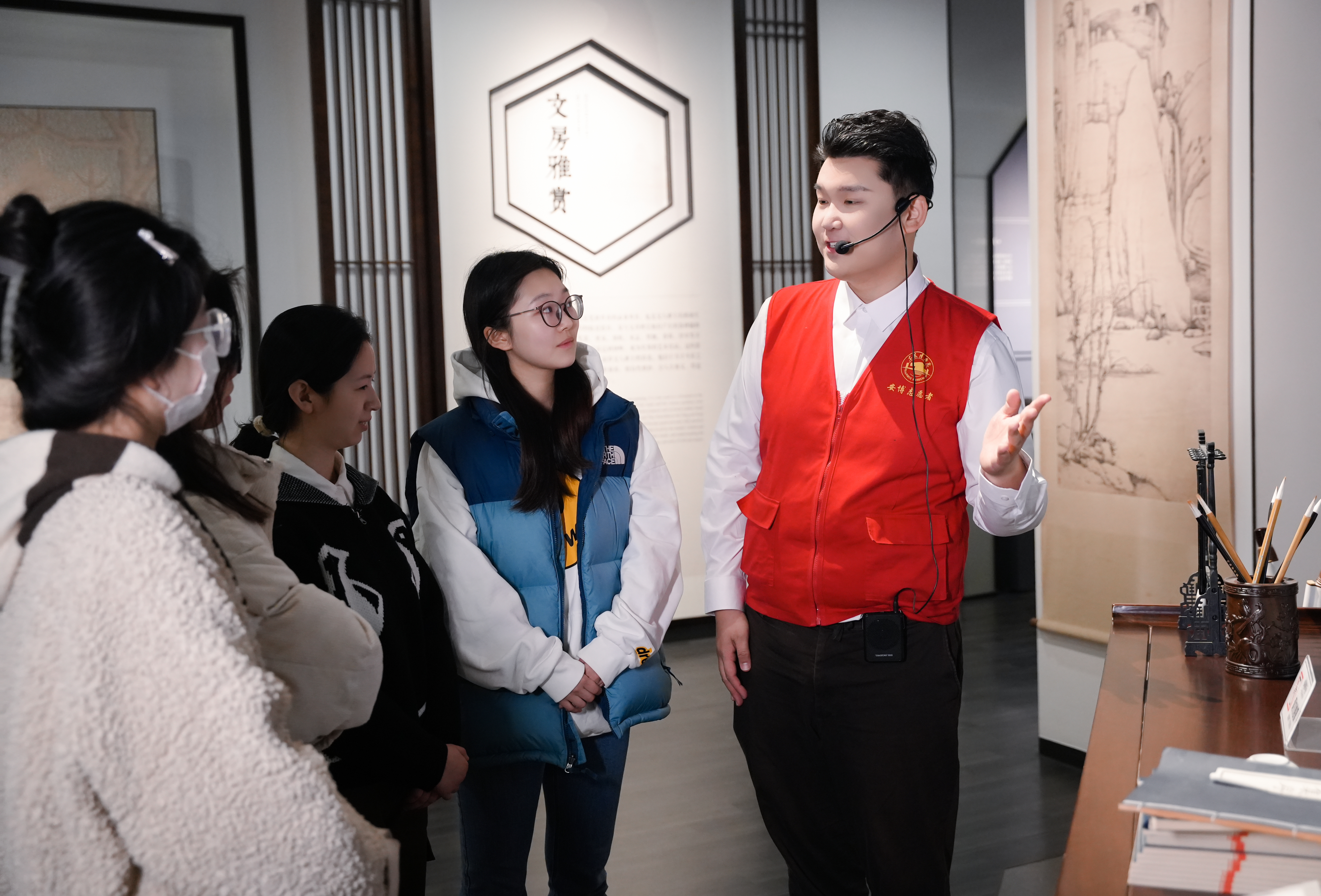 (夏梦慈和同学们正在向指导老师学习文物讲解技能)