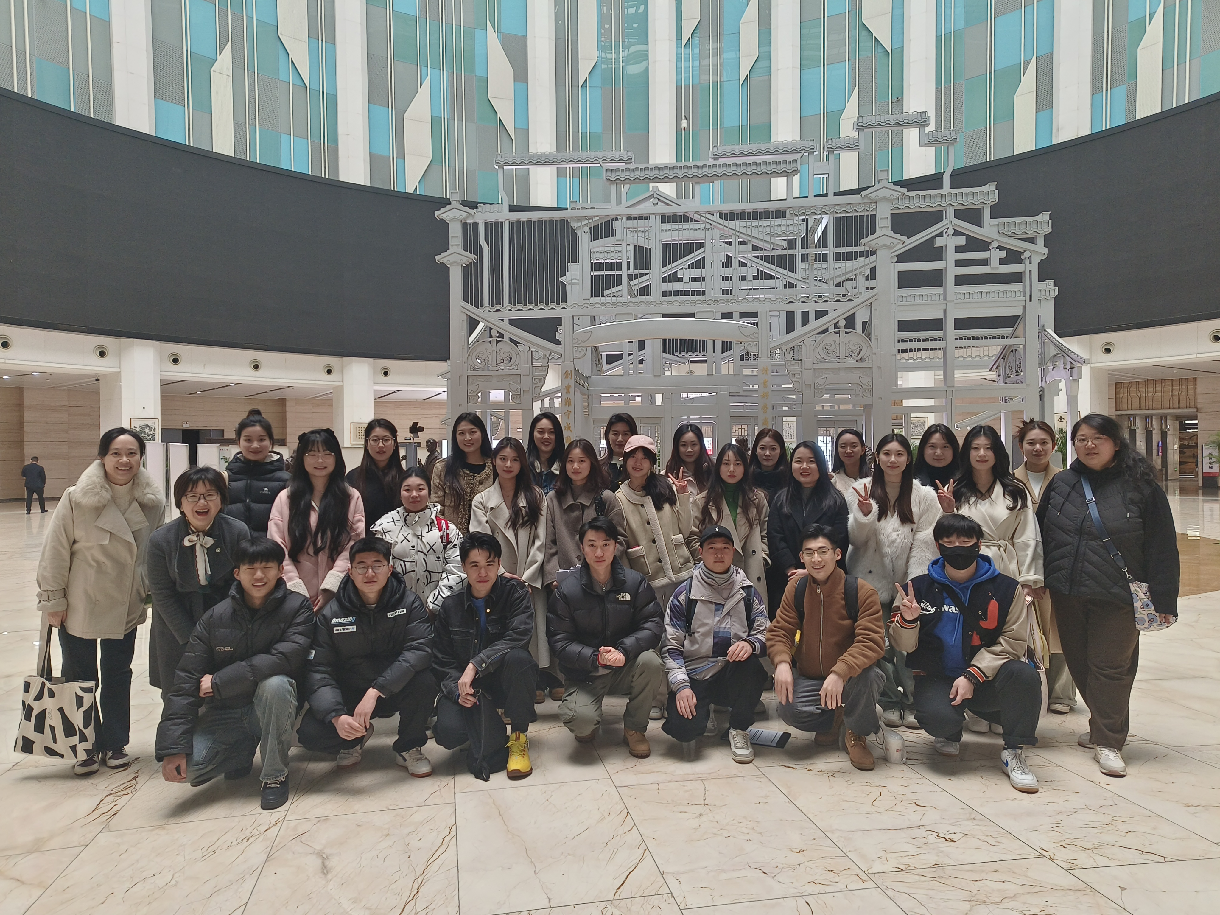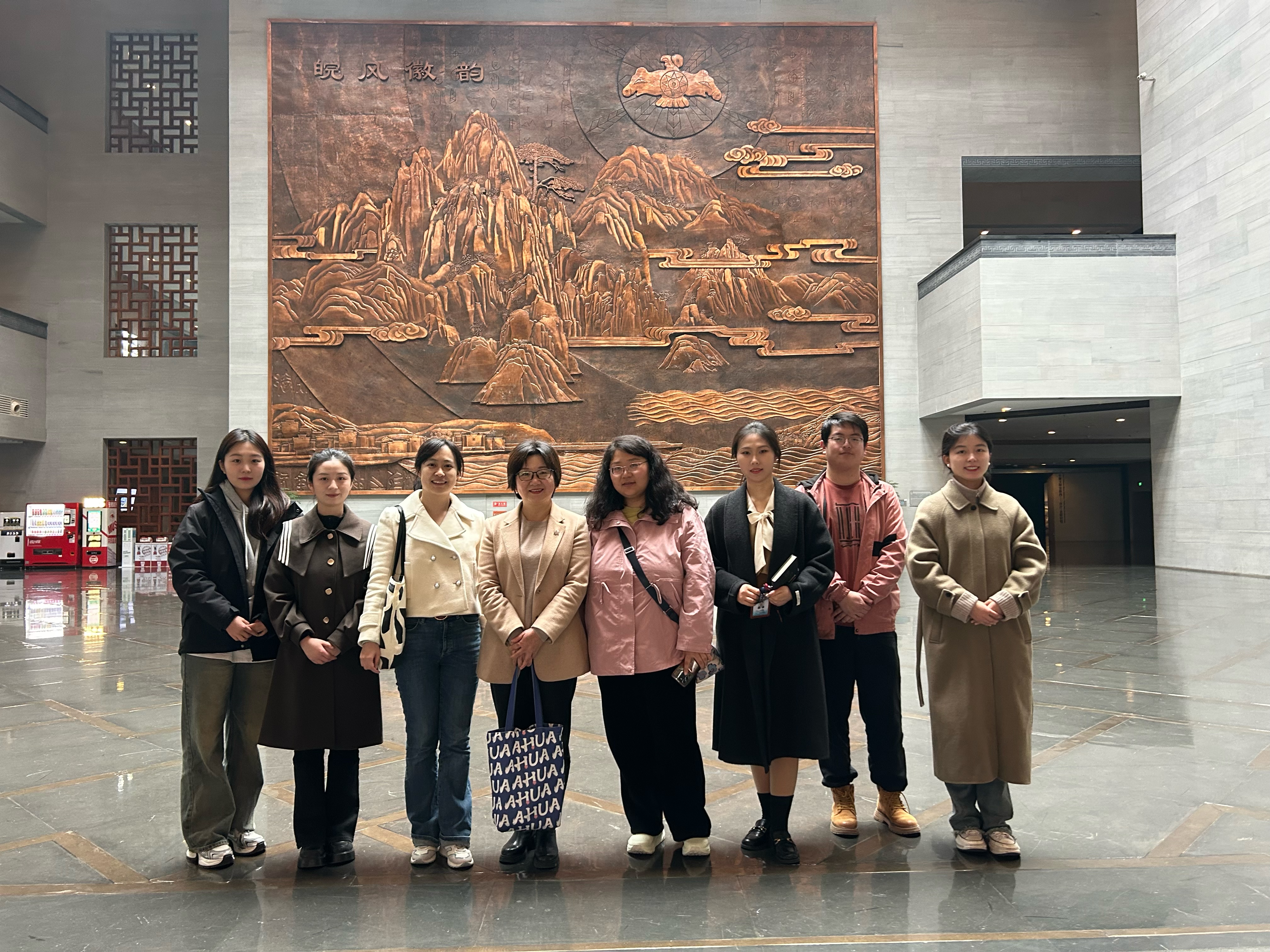 (安徽广播电视台的老师在省台主楼大厅为实习生拍下合影)