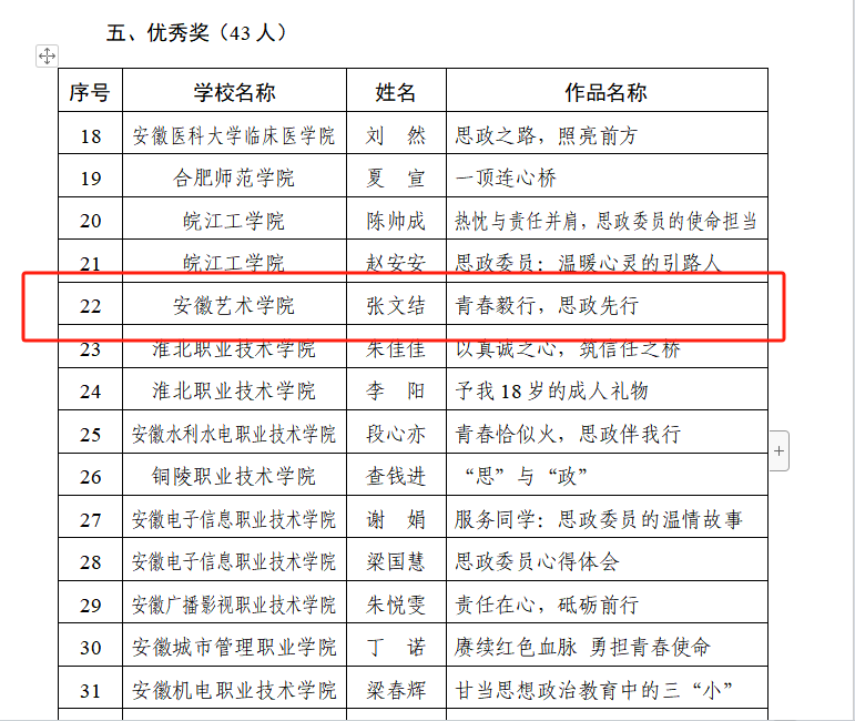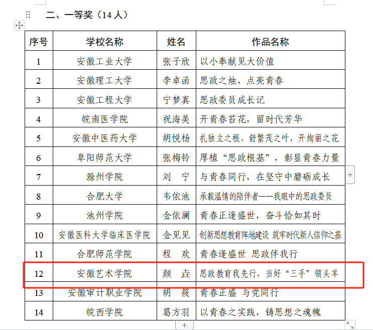 近日,由安徽省高等学校思想政治教育研究会主办的全省高校班级思政委员征文比赛结果揭晓,我校推选的2篇征文均获奖。