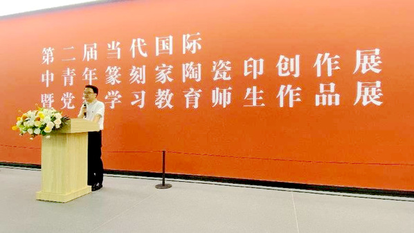 6月14日上午,美术学院党纪学习教育师生作品展暨第二届当代国际中青年篆刻家陶瓷印创作展在资城科创艺术中心开幕。美术学院党总支书记陈明海致词,院长束新水主持开幕式。