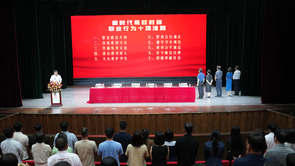 校党委委员、纪委书记、监察专员程宗林领诵《新时代高校教师职业行为十项准则》。