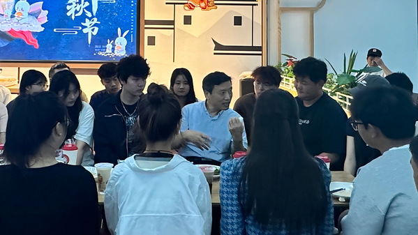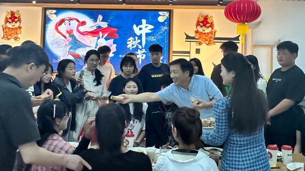 午餐会现场,陈林和师生们一起分享中秋节月饼。师生互动交流,共话家乡中秋习俗、故事。同学们纷纷表示,虽然没能回家过节,但依然感受到了浓厚的节日氛围和安艺这个大家庭的温馨体贴。
