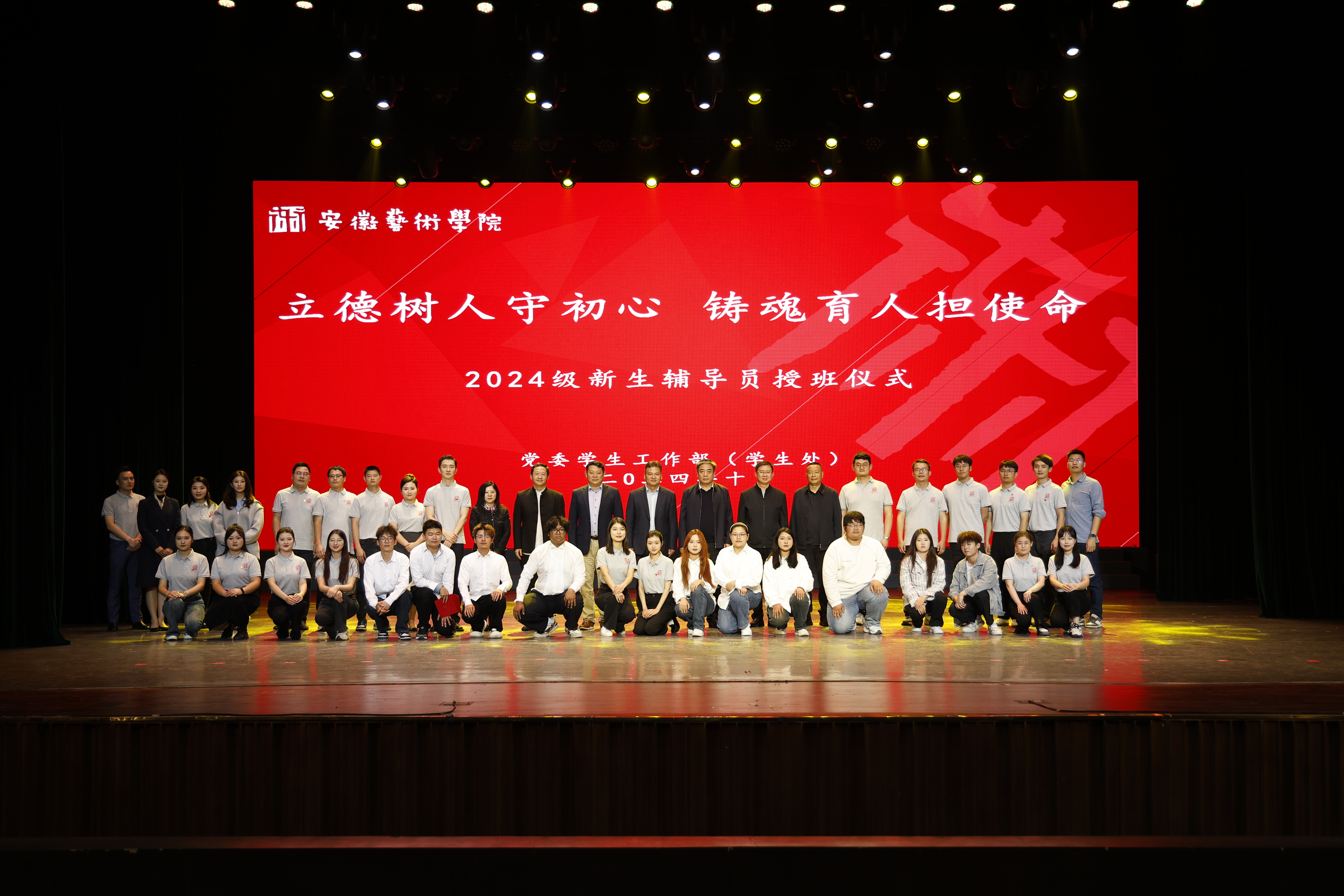 整场仪式由戏剧学院副书记曹磊、安徽省辅导员技能大赛获奖者张高亮、马悦以及校长助理陈欣蕊同学共同主持。全体2024级新生辅导员和学生代表共同演唱《我们的生活充满阳光》,用饱含深情的歌声和鲜活的奋斗场景为观众描绘出高校辅导员同青年大学生共同相处、共同成长的温馨底色。