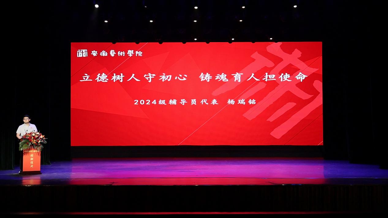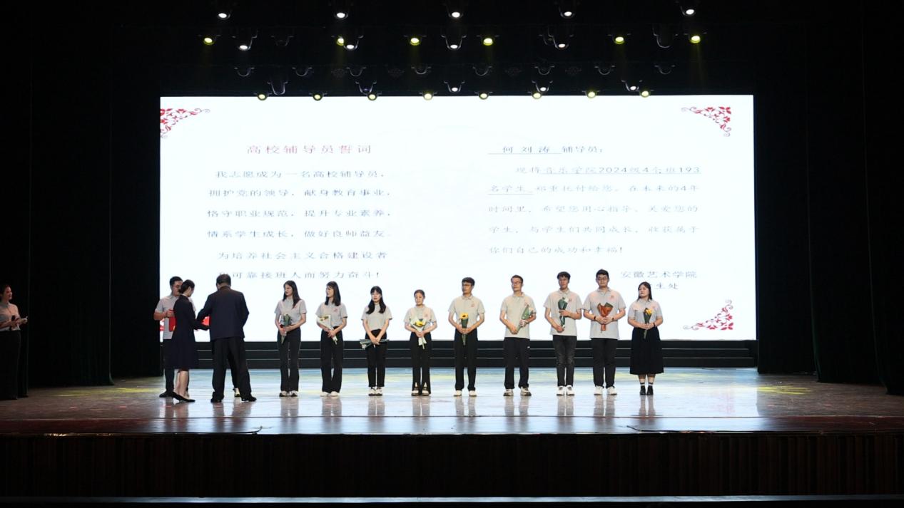 整场仪式由戏剧学院副书记曹磊、安徽省辅导员技能大赛获奖者张高亮、马悦以及校长助理陈欣蕊同学共同主持。全体2024级新生辅导员和学生代表共同演唱《我们的生活充满阳光》,用饱含深情的歌声和鲜活的奋斗场景为观众描绘出高校辅导员同青年大学生共同相处、共同成长的温馨底色。