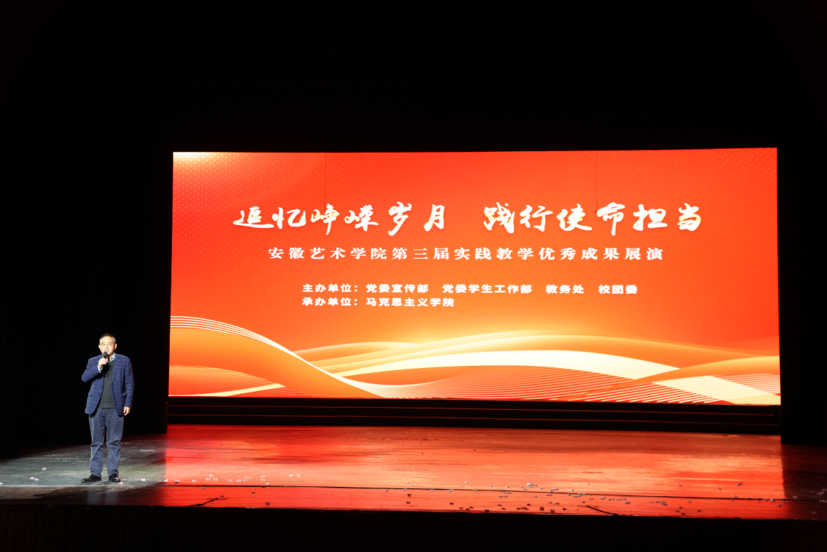 马克思主义学院以思想政治理论实践课为依托,以“追忆峥嵘岁月 践行使命担当”为主题开展了覆盖2023级全体本科生的实践教学。在思政课教师和专业课教师共同指导下,同学们编创朗诵、歌曲、短剧、黄梅戏、舞蹈等节目近五十个,创作油画、图片、摄影、综合材料和设计等作品百余件,用艺术化载体讴歌在中国共产党的领导下,75年来国家建设所取得的伟大成就,以大学生喜闻乐见的形式阐释“中国共产党为什么能,中国特色社会主义为什么好,归根到底是马克思主义行,是中国化时代化的马克思主义行”。