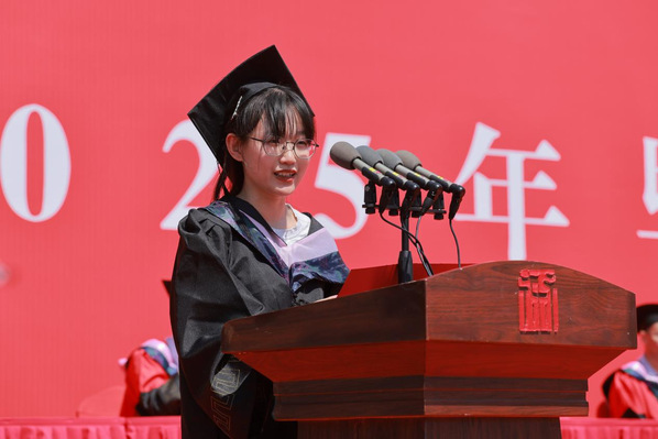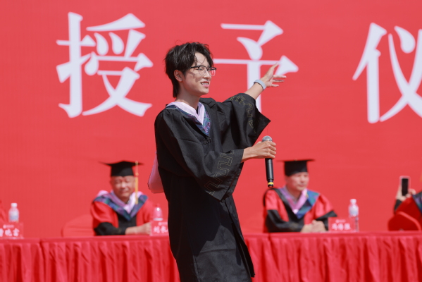 毕业典礼现场,来自美术学院2021级绘画专业的钱逸昕同学作为毕业生代表进行发言。钱逸昕讲述了自己在校学习期间的收获与感悟,并对学校的培养、老师们的指导表示感谢。