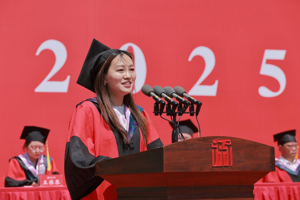 音乐学院教师王昕作为教师代表发言。她鼓励同学们,离校后一定要坚持艺术理想,保持“原生态”、修炼“跨次元”技能、守护“不实用”的浪漫,并将“崇德尚艺 知行合一”的校训精神刻进未来的每一段乐章里,熔铸成创作基因。真正的艺术家永远“脚下染泥土,心中有莲花”,愿同学们带着博业体育(中国)官方网站-登录入口的烙印,在艺术与良知交织的路上,把人间走成自己的代表作。