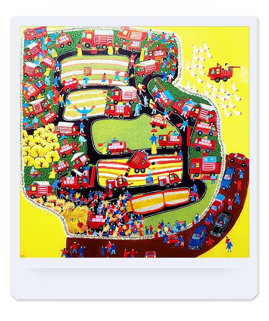 本作品以中国农耕文明为内核,通过当代乡土绘画的视觉语言,展现了新时代乡村振兴的壮美画卷。画面以层叠的田野为背景,将传统农事场景与现代科技农业并置,金黄稻浪与大型器械播种、收割场景与文旅景观形成诗意对比;以细腻的笔触刻画农民形象的坚韧与希望,辅以象征丰收的民俗符号,如麦穗、家禽与智能化机器,隐喻农耕文化的传承与创新。作品融入丙烯与综合材料的肌理层次,在写实与抽象间构建出乡土中国的时代叙事,致敬土地的同时,亦表现出人与自然共生共荣的未来图景。