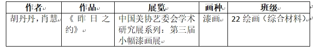 近日,美术学院2022级绘画(综合材料)班胡丹丹、肖慧两位同学合作作品《昨日之约》,成功入围由中国美术家协会主办的“中国美协艺委会学术研究展系列:第三届小幅漆画展”。