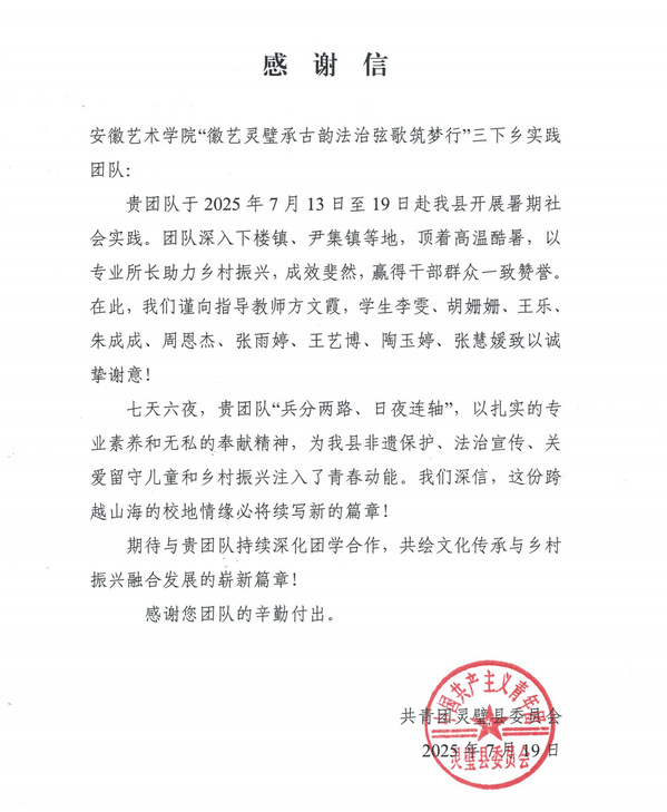7月19日,共青团灵璧县委员会向我校“徽艺灵璧承古韵 法治弦歌筑梦行”暑期“三下乡”社会实践团队发来感谢信,对团队在非遗文化保护、法治宣传教育、留守儿童关爱及乡村振兴等方面作出的积极贡献表示感谢。