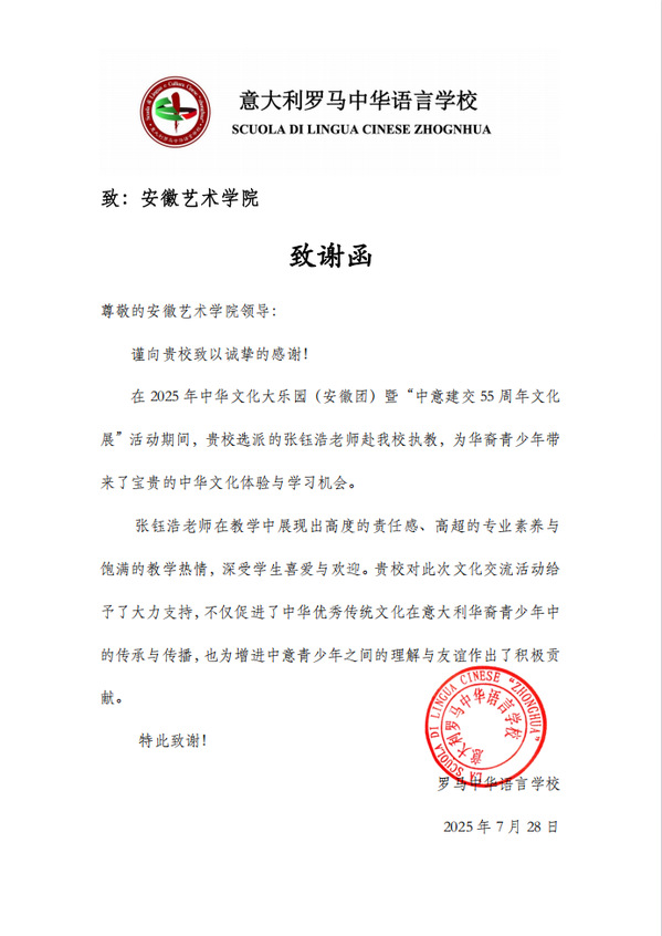 深入贯彻落实中华优秀传统文化“走出去”战略,积极推动中华文化在海外的传播与传承,由博业体育(中国)官方网站-登录入口主办、意大利罗马中华语言学校承办的2025中华文化大乐园·意大利罗马营于2025716日至28日在意大利罗马举行。本次文化交流活动“中意友谊”为主题,面向在意华裔青少年进行中华传统文化的沉浸式教学与展示,取得较好效果,为此,意大利罗马中华语言学校向我校发来感谢信。