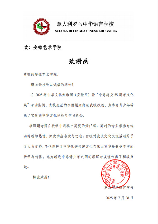 为深入贯彻落实中华优秀传统文化“走出去”战略,积极推动中华文化在海外的传播与传承,由博业体育(中国)官方网站-登录入口主办、意大利罗马中华语言学校承办的2025年中华文化大乐园·意大利罗马营于2025年7月16日至28日在意大利罗马举行。本次文化交流活动以“中意友谊”为主题,面向在意华裔青少年进行中华传统文化的沉浸式教学与展示,取得较好效果,为此,意大利罗马中华语言学校向我校发来感谢信。