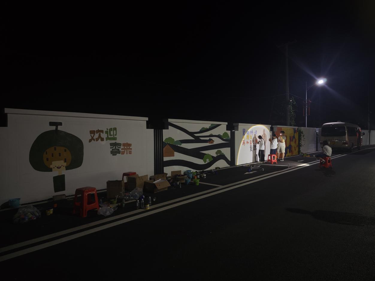 夜幕降临时,同学们依然不愿停下手中的画笔,大家都憋着一股劲,想一鼓作气,将心中的创意淋漓尽致地表达出来。果子园乡佛堂坳村第一书记姚君和乡团委书记陈源远只好临时安排车辆提供照明,支持同学们创作至晚上九点结束。