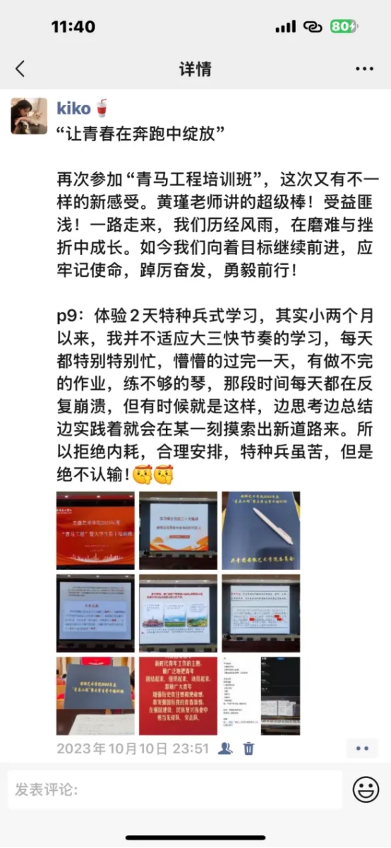求学之路,如同攀登雪山,充满挑战。幸运的是,安艺的师友们如同缕缕暖阳,始终照耀并温暖着我的征途,融化着前行的冰雪。我们音乐学院李伟院长就是一位言传身教的领路人,他亲切随和、充满活力,每当在校园里遇见,李院长总是笑盈盈地关心我们的学习和生活。令我颇感敬佩的是,2023年校运动会上,院长报名参加了长跑项目,他用实际行动诠释了毅力与坚持,正如他时常叮嘱我们的那样:“音乐人尤其需要强健的体魄,才能支撑起繁重的排练、紧张的演出和长远的艺术生涯。”在我们一批同学成为学院“拔尖人才”之后,院长亲自召集我们座谈,鼓励大家要自信、大胆地向前走,铭记“崇德尚艺 知行合一”的校训,做德才兼备的艺术人才。这份期许,是我们不断努力的重要动力。