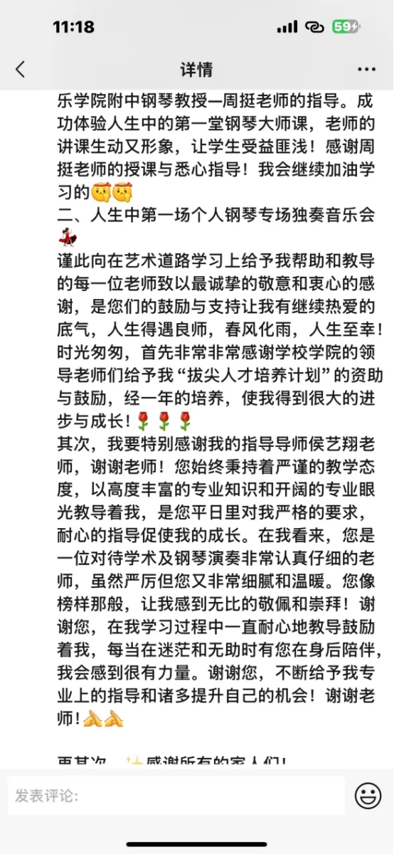 回想跟随侯老师学习的日子,他对艺术的高标准、严要求曾让我倍感压力,我甚至为此偷偷掉过眼泪。但侯老师本身就是一位极其自律、技艺精湛的青年演奏家,他的专业素养和舞台魅力如同偶像般引领着我。每当遇到瓶颈,想到侯老师的榜样力量,我便有了克服困难的勇气。2024年底,当我成功举办个人钢琴独奏音乐会,在曲终时看到侯老师第一个站起来,为我用力鼓掌的瞬间,泪水再次涌出,那一刻,所有的严格要求都化作了最深的感激,我明白了那些严厉背后的殷切期许,也明白了所有的坚持都藏着被看见的光芒。后来,当我陆续收到不同院校的录取喜讯后,第一时间向侯老师报喜,他难得地向我竖起了大拇指,那一刻的感动与感恩,凝结成永不褪色的成长勋章。原来那些曾以为严苛的标准,早已在日复一日的雕琢中,成为我叩响梦想之门的钥匙。