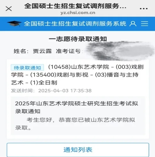 贾云露的一志愿待录取通知