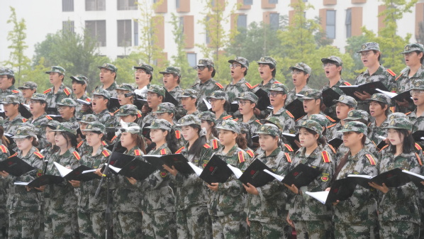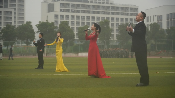 分列式结束后,军事科目与文艺汇报表演精彩上演。音乐学院师生倾情合唱《艺心向阳》《向往》,歌声铿锵有力又饱含热忱,以青春旋律传递我校艺术特色;女子匕首操方队出刀迅猛、踢腿刚劲,动作精准利落、气势如虹,展现“巾帼不让须眉”的飒爽;男子战术分队模拟真实战场,依托掩体快速跃进、协同搜索、交替掩护,动作敏捷、配合默契,凸显扎实战术基础;舞蹈学院群舞《鼓舞江淮》以鼓为魂、以舞传情,激昂鼓点搭配豪迈舞姿,生动展示青春力量。