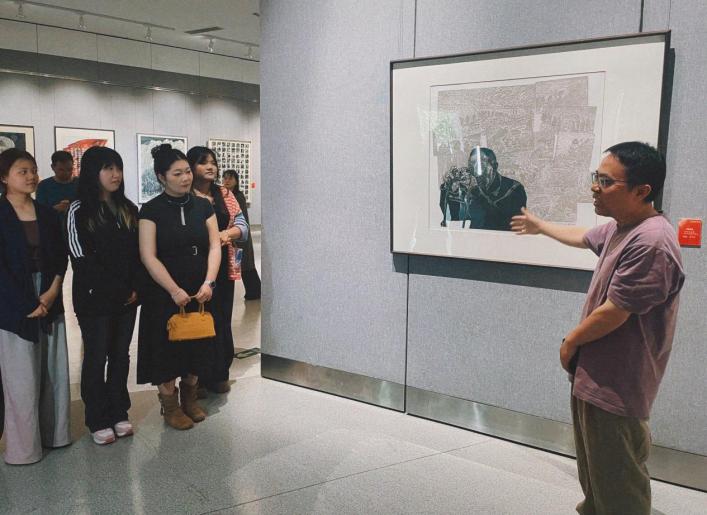 开展当天,美术学院版画方向师生赴现场观摩学习。观展前,安徽省美协版画艺术委员会主任、我校客座教授师晶首先介绍了本次展览的整体情况。随后,美术学院教师张婷婷对部分作品进行了专业导赏。在互动环节中,部分参展艺术家们从创作理念、技法运用、情感表达等维度,深入解读了自己作品背后的艺术思考,与我院师生围绕主题性版画的创作实践展开了交流与分享,通过思想碰撞进一步拓展了艺术视野。
