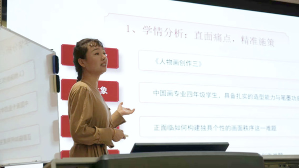 美术学院曹忆潜以《人物画创作》参赛,采用“传统为根、AI 为用、人为主” 融合教学,讲授人物画构图创新方法。课程引导学生树立“以我为主、科技为辅” 创作观,在传承传统中实现当代表达。