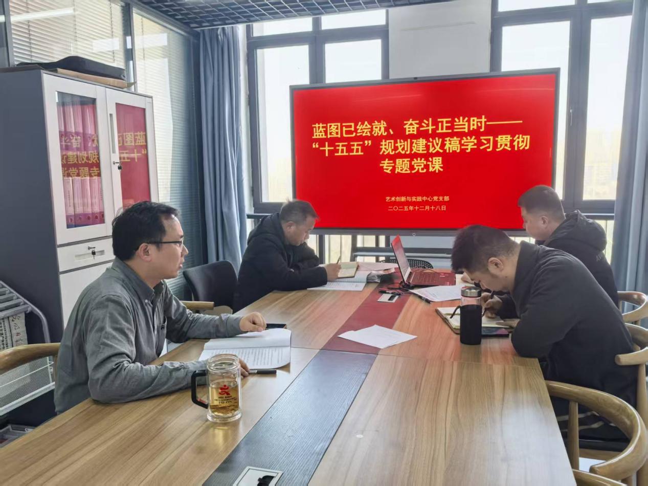 为深入学习贯彻党的二十届四中全会精神,深刻领会《中共中央关于制定国民经济和社会发展第十五个五年规划的建议》的核心要义,12月18日下午,艺术创新与实践中心党支部在崇德楼708室召开专题党课学习会议。本次党课以“蓝图已绘就、奋斗正当时”为主题,由党支部书记刘勇主讲,支部全体成员参加。
