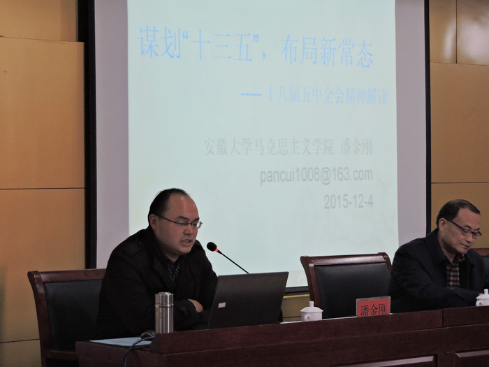 按照学院党委的统一部署,根据学院《学习宣传贯彻党的十八届五中全会精神工作方案》,公共教学部(思政部)部署全体思政课教师参加以党的十八届五中全会精神为主要报告内容的培训活动。2015年12月4日下午,我院思政课教师赴安徽大学新校区学术交流与培训中心四楼聆听马克思主义学院潘金刚教授做的题为《谋划“十三五”,布局新常态 ——十八届五中全会精神解读》专题报告。