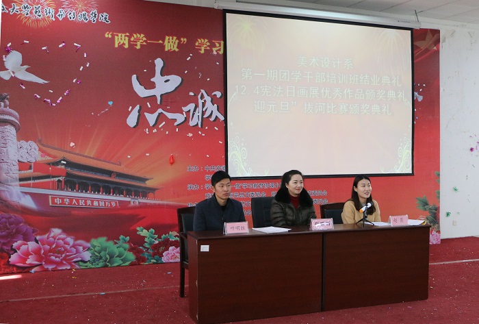 12月30日中午,美术设计系举行第一期团学干部培训班结业典礼暨12.4法制宣传周美术设计作品展颁奖典礼和“迎元旦”拔河比赛颁奖典礼。美术设计系党总支副书记张丽丽、学生党支部书记叶明胜、团总支书记赵晨出席会议,系学生会、团总支全体成员,各班班长、团支书参会。