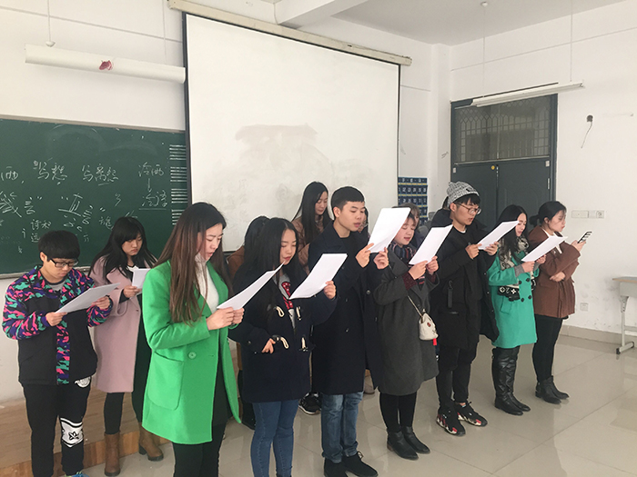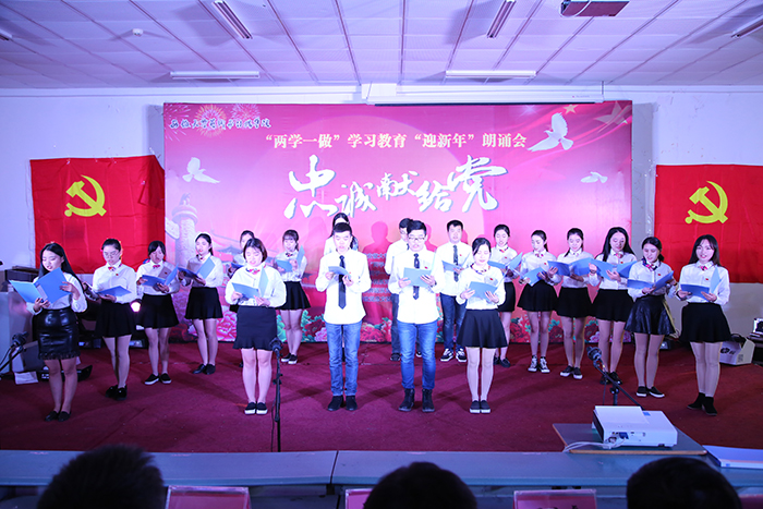 2016年12月23日下午,学院一号教学楼第二阶梯教室《忠诚献给党》—“两学一做”学习教育“迎新年”朗诵会会上,新闻播音系学生党支部的20位学生党员迈着矫健的步伐一次次走向舞台,齐诵党章、党规和习近平总书记重要讲话的内容节选,他们的队列整齐、精神抖擞,他们的声音响亮、气势豪迈,获得了现场观众的热烈掌声,把“两学一做”学习教育朗诵会气氛一次又一次推向了高潮。这一刻,20位党员内心也充满激动,他们把最真挚的感情最响亮的朗诵献给党!