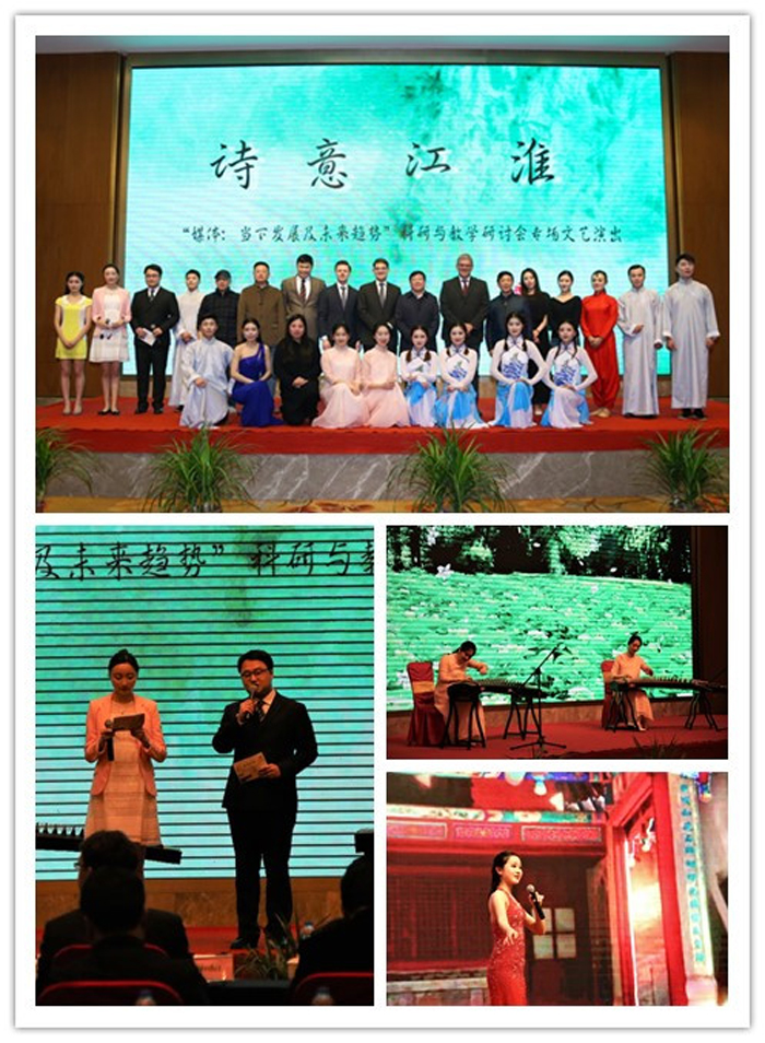 此次学术论坛,也并不局限于学术,亮点频现。在论坛现场的一角,专门设有一个小型的AR技术演示区,放置了两台电脑,体验者只要带上眼镜,就可以体验虚拟现实场景,在发言和交流的间歇,不少与会嘉宾都体验了一下新的媒体技术;中午休息时,中科大周荣庭教授还与现场师生亲切互动,演示了神奇的可视化教材,引起了一轮围观。论坛最后,音乐舞蹈系和戏剧影视系的师生,还为中外嘉宾奉上了一台名为“诗意江淮”的专场文艺演出,历时一天的学术研讨会在曼妙的歌舞声中圆满落幕。