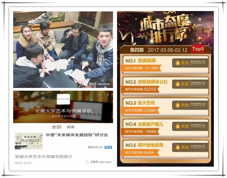 3月14日,网易安徽向新闻播音系发来祝贺,祝贺我院网易号关于中德“媒体:当下发展与未来趋势”科研与教学研讨会的直播喜获网易号合肥“城市态度排行榜”第三名。这是新闻播音系贯彻落实学院应用型人才培养方案,深化与网易安徽战略合作,提高学生专业能力所获成绩。