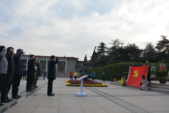全体人员拾阶而上,站在烈士纪念碑前,庄严肃穆之感油然而生。周之虎率领党委中心组成员在烈士纪念碑前肃立,向革命烈士纪念碑敬献花篮,深深三鞠躬,表达对革命先烈的深切缅怀和无限敬仰。面对鲜艳的中国共产党党旗,周之虎同志举起右拳庄重领誓,带领全体人员重温了入党誓词,表达了“不忘初心,牢记使命”的坚定政治信念。在安徽革命烈士事迹陈列馆,大家瞻仰了安徽革命先辈的光辉事迹,领悟安徽红色基因、红色传统、红色文化。