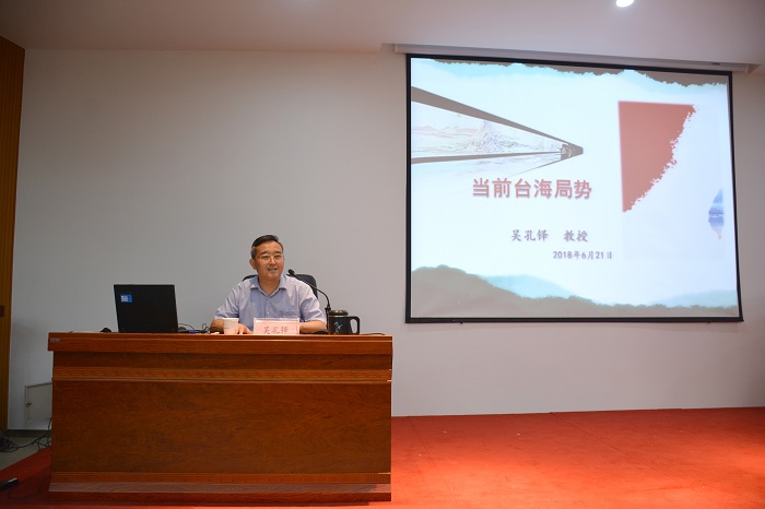 为全面贯彻落实党的十九大精神,提高大学生思想政治意识,根据学院统一安排,6月21日下午,新闻播音系在院学术报告厅举办了形势与政策报告会。学院党委宣传部部长、办公室主任吴孔铎教授为新闻播音系师生作当前台海局势报告。报告会由新闻播音系团总支书记陈伟伟主持。