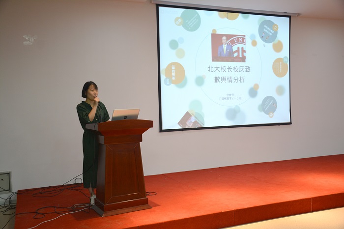 这次汇报是由《网络舆情分析与应对》的授课老师刘涛组织发起,17级广播电视学1、2、3班共同参与的。学习成果汇报邀请了李卫国、戚庆燕、王荔挺与郑梦琛等几位专业老师作为评委嘉宾,一同见证同学们的学习成果。