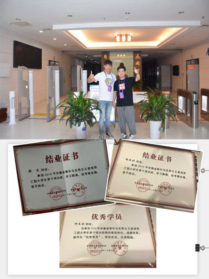 8月25日至29日,2018年安徽省青年马克思主义者培养工程大学生骨干培训班在安徽师范大学花津校区举办。本次培训为期5天,聚焦新时期社会对人才的要求和大学生骨干应具备核心能力,采取课堂教授、现场教学、交流分享、团体辅导和实践考察等方式,全方位提升学员的政治素质、业务能力。我院学生组织2名学生骨干代表郑杰、邓杰彬参加了本次培训并顺利结业,其中邓杰彬荣获“优秀学员”称号。