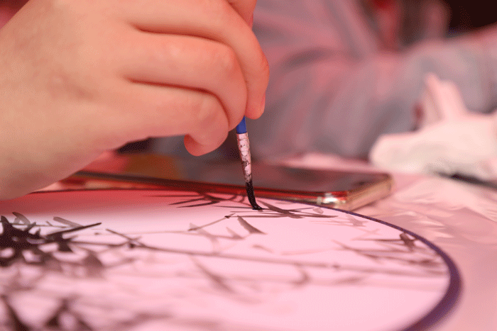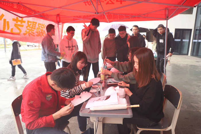 活动前期,学生会早早采购了各种DIY绘画创作工具,有体现国粹精神的脸谱、古风古韵的团扇、翩翩风采的折扇等等。活动伊始,氛围就空前热烈。前来参与DIY体验的同学络绎不绝,现场摆放的桌椅还没到中午就已坐满。