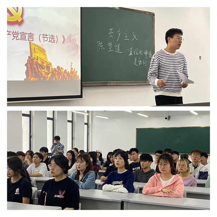 数媒二班的同学们还在辅导员王亚鹏的带领下深情朗诵《共产党宣言》,重温这一历史巨著。随后,王亚鹏老师同学们回顾了中国共产党的百年奋斗历史。