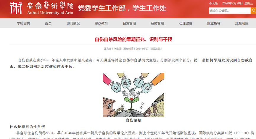 在开展心理健康活动月的过程中,我校将自身规模小,艺术生感性强烈的特点与春季精神障碍高发的特点结合起来,将干预中的典型案例处置方法,和对《中华人民共和国教育法》和《中华人民共和国精神卫生法》的普及宣传有机的结合到一起,对辅导员和学生心理委员的业务培训起到了事半功倍的效果。