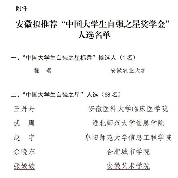 由团中央基层组织建设、全国学联秘书处开展的2020年度“中国大学生自强之星奖学金”评选工作于今年7月正式启动。经过班级评议、系部推荐和校级选拔,我校推荐美术设计系张姣姣同学参加全省评选。近日,经团省委遴选,张姣姣同学被评为2020年度“中国大学生自强之星奖学金”安徽候选人。