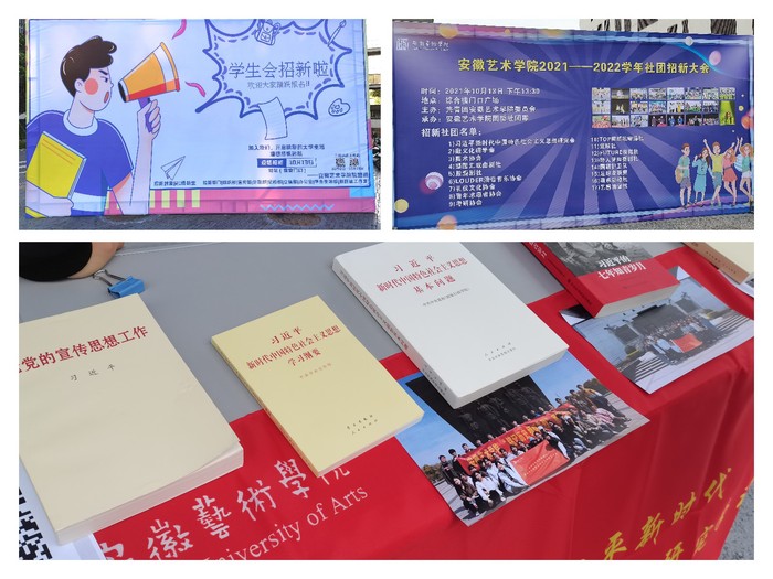 “理想扬帆远航,开启精彩的大学生活。”食堂门口的宣传展牌格外引人注目。校团委、校学生会的学生干部们热情地欢迎前来报名的新生,耐心地向新生解释部门职责,指导他们填表。综合楼门前广场,是17个社团的招新现场。习近平新时代中国特色社会主义思想研究会、徽文化研学会、LOUDER清音音乐协会、考研协会、篮球社、路人皆知喜剧社等各有千秋,招新方式也可谓新颖有趣,他们用专业优势、特长爱好宣传校园文化、绽放多彩青春。招新活动持续了整个下午,直到傍晚时分夕阳渐垂,仍有活跃的社团成员载歌载舞,引来声声喝彩。
