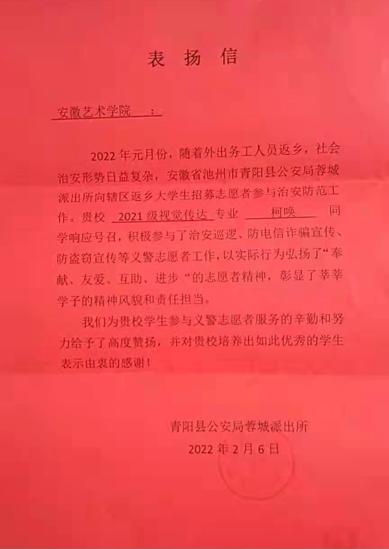 近日,池州市青阳县公安局蓉城派出所向我校发来表扬信,对美术设计系2021级视觉传达设计2班柯唤同学在志愿活动中的优秀表现给予赞扬。