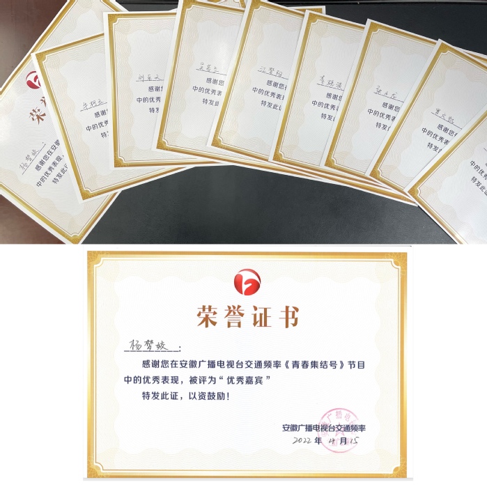 安徽广播电视台交通广播《青春集结号》栏目组还为优秀作品的朗读者颁发荣誉证书。(撰稿:杨梦姣 初核:赵晨 编辑:朱新水 审定:束舒娅)