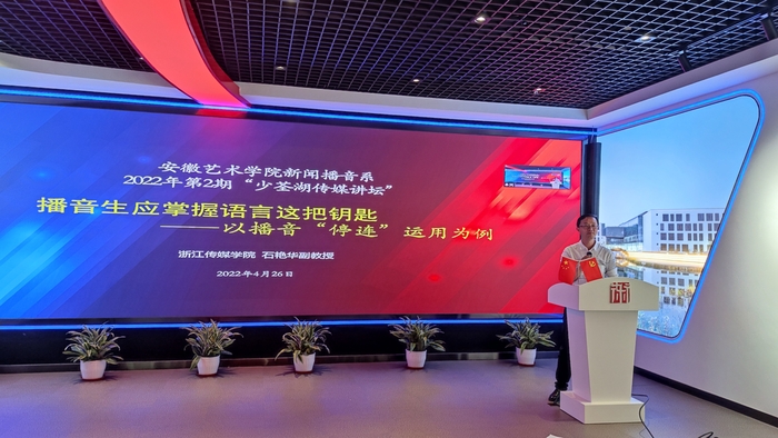 4月26日晚,新闻播音系在播音楼五楼VR新媒体党员活动中心举办2022年第2期“少荃湖传媒讲坛”,特邀浙江传媒学院石艳华副教授为广大师生作题为《播音生应掌握语言学这把钥匙——以播音“停连”运用为例》线上讲座。系副主任尹广富主持讲座。