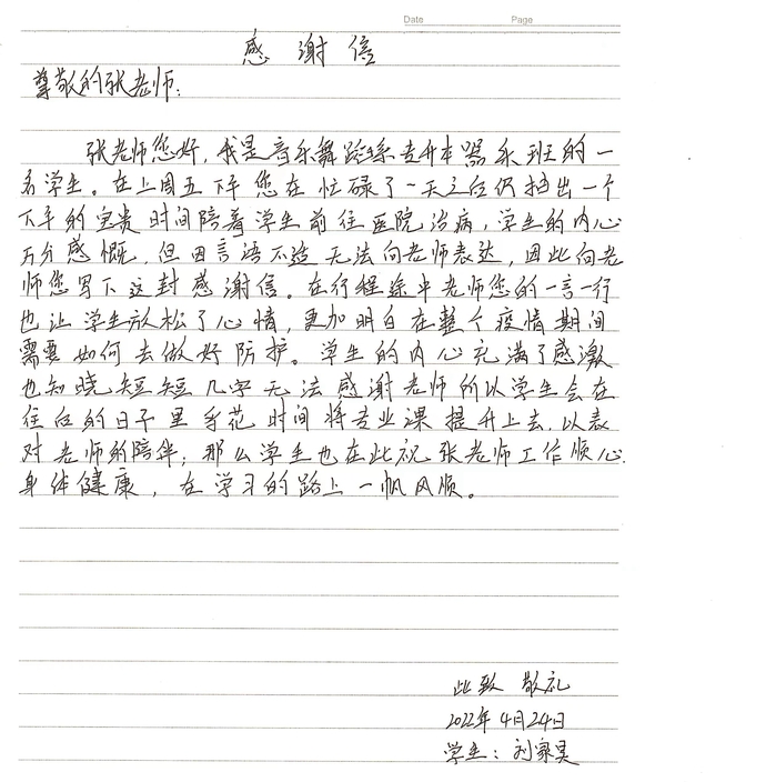 “我不善言辞,没有当面向老师表达感激,因此写下这封感谢信……”这是音乐舞蹈系21级器乐班学生刘家昊在感谢信中写给老师的知心话。