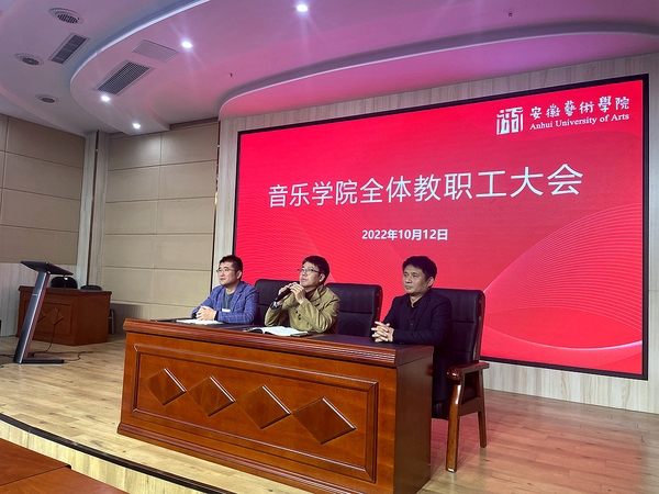 10月12日下午,音乐学院全体教职工大会在音乐南楼报告厅召开。会议由校党委委员、音乐学院党总支书记、院长孙来法主持。