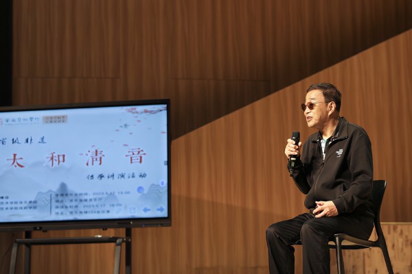 “我认为太和清音最大的魅力是其既有北方的豪放,又有江南的委婉缠绵”。古稀之年的太和清音曲作家高虎来到现场,为师生讲授太和清音的作曲要素,并分享了自己与太和清音的故事。