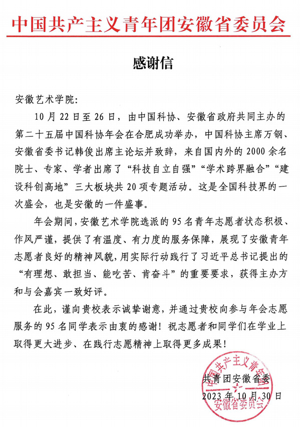 信中表示,中国科协年会期间,我校志愿者状态积极、作风严谨,提供了有温度、有力度的服务保障,展现了安徽青年志愿者良好的精神风貌,用实际行动践行了习近平总书记提出的“有理想、敢担当、能吃苦、肯奋斗”的重要要求,获得主办方和与会嘉宾的一致好评。