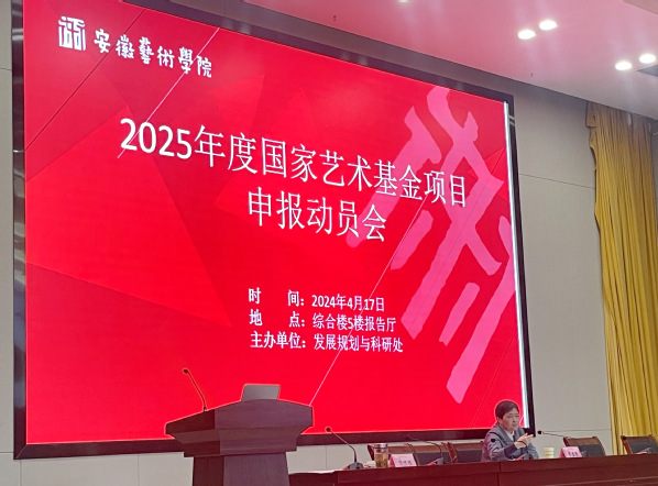 4月17日,2025年度国家艺术基金项目申报动员会在综合楼5楼报告厅召开,邀请安徽省艺术研究院原书记、院长,一级编剧,国家社科基金艺术学安徽省规划办原主任、国家艺术基金安徽省中级管理办公室原负责人李春荣作政策解读和申报指导。发展规划与科研处副处长冯传胜主持会议。