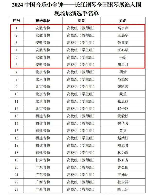 近日,由安徽省音乐家协会报送的我校2名学生朱亚男、汪心琰成功入围2024中国音乐小金钟——长江钢琴第四届全国钢琴展演现场展演(高校学生组)。赛事组委会在全国各报送单位中选出48名选手参加现场展演,安徽省共入围4名。