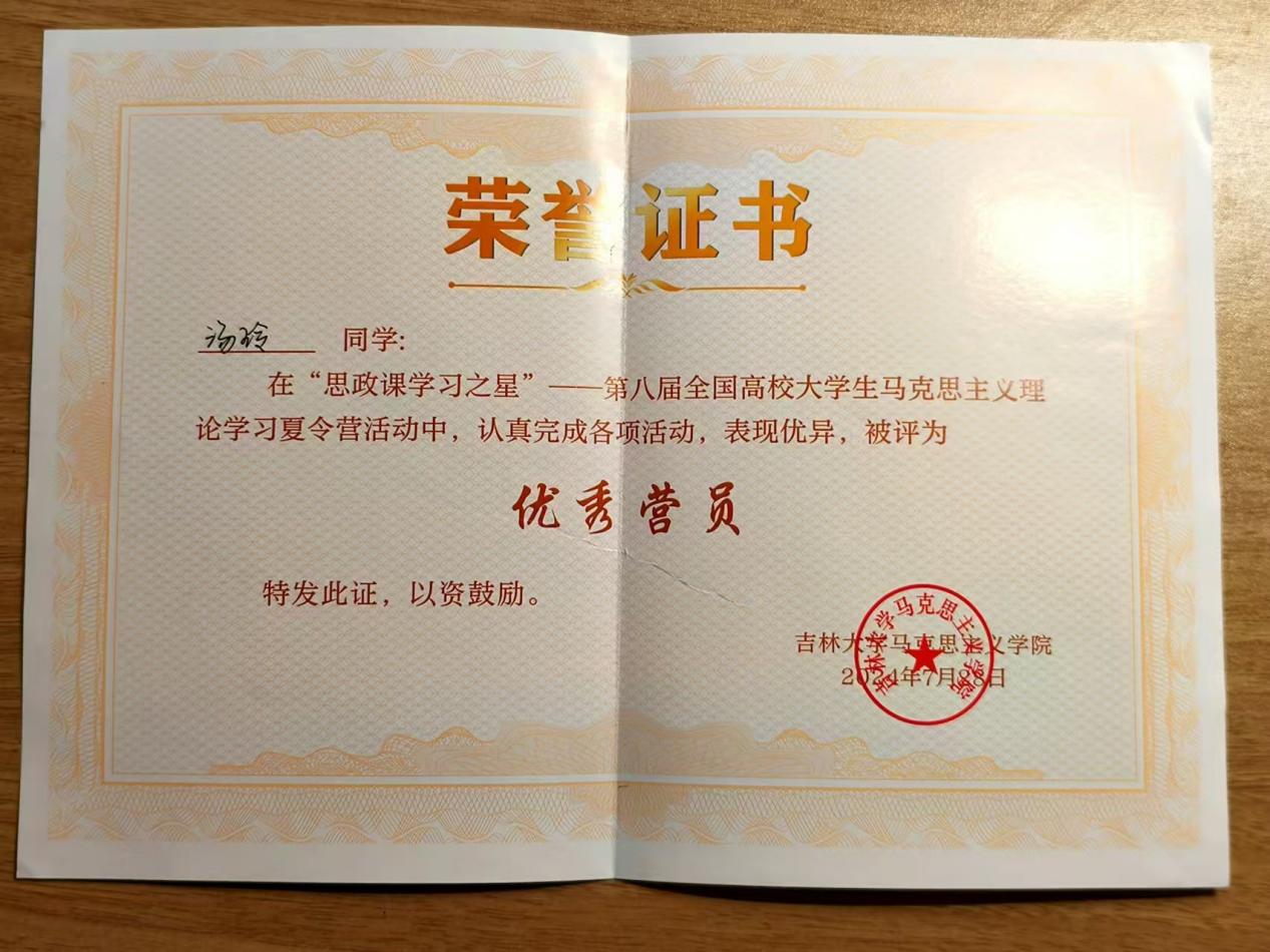 “思政课学习之星”第八届全国大学生马克思主义理论学习夏令营暑假期间在吉林省长春市举行。我校2022级播音与主持艺术专业本科生汤玲同学参加此次夏令营,顺利结业并获评“优秀营员”称号。