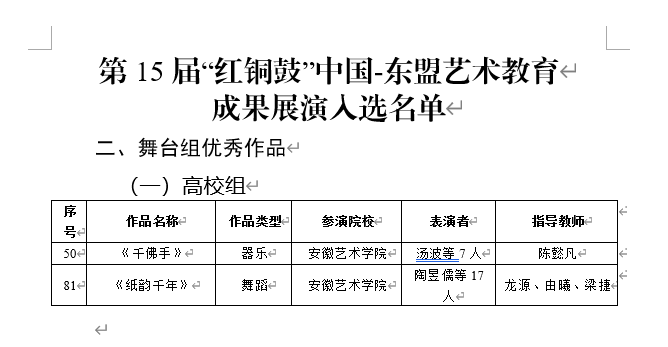 近日,在第15届“红铜鼓”中国—东盟艺术教育成果展演上,我校音乐学院选送的器乐作品《千佛手》和舞蹈学院选送的舞蹈作品《纸韵千年》分别获得舞台组高校组优秀作品。